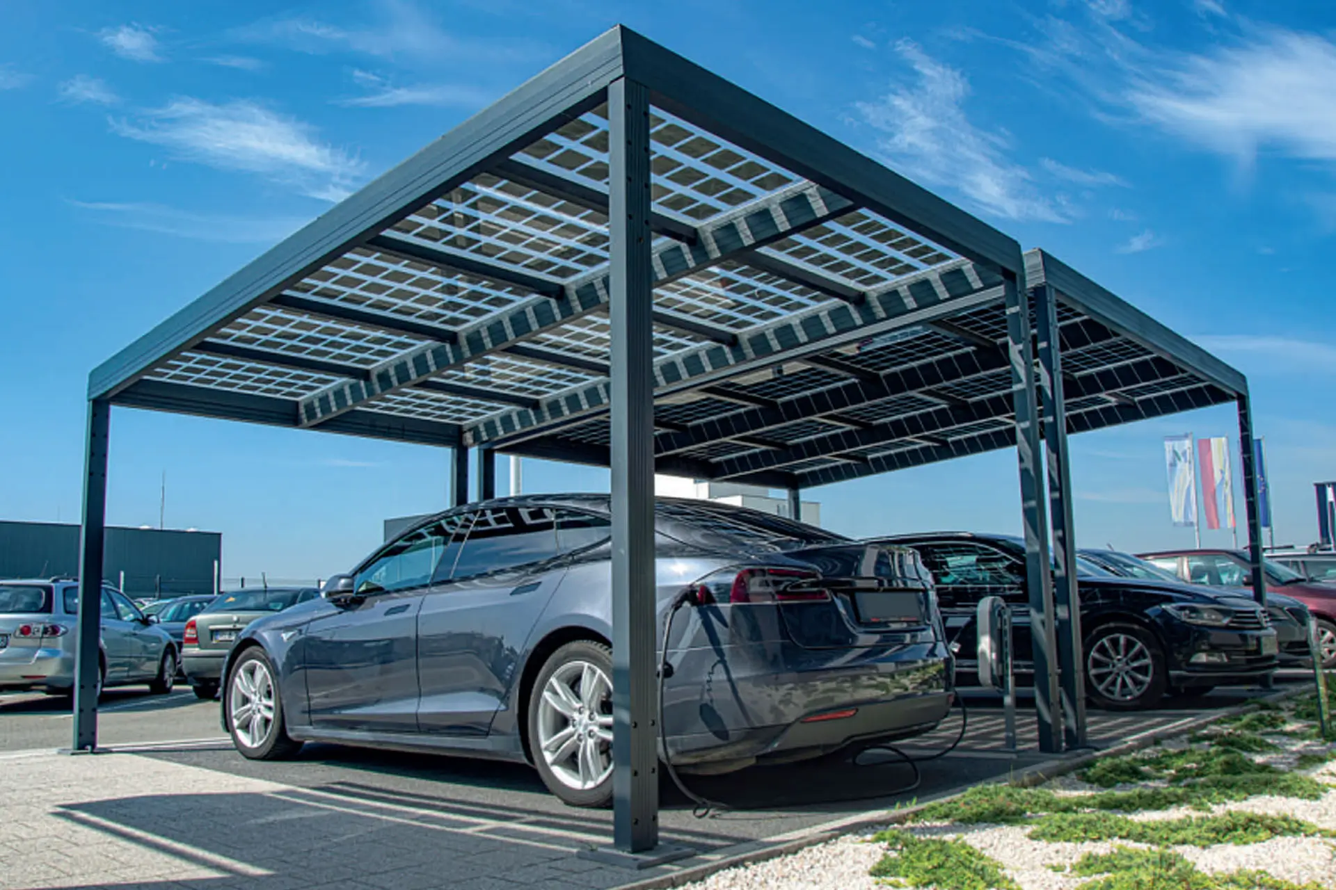 The innovative design means all the solar cabling is hidden and protected in the framework. Equally the EV charging ports and inverters can be housed within the framework.